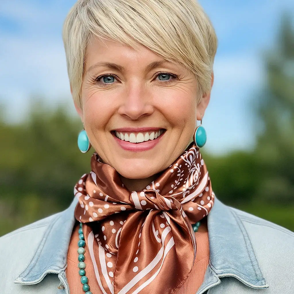 Our classic wild rag/scarf trimmed in copper with a floral paisley pattern. It is a square and measures 35" x 35". It is sure to add a bright pop of color to any outfit. 100% machine washable polyester, silky and soft.