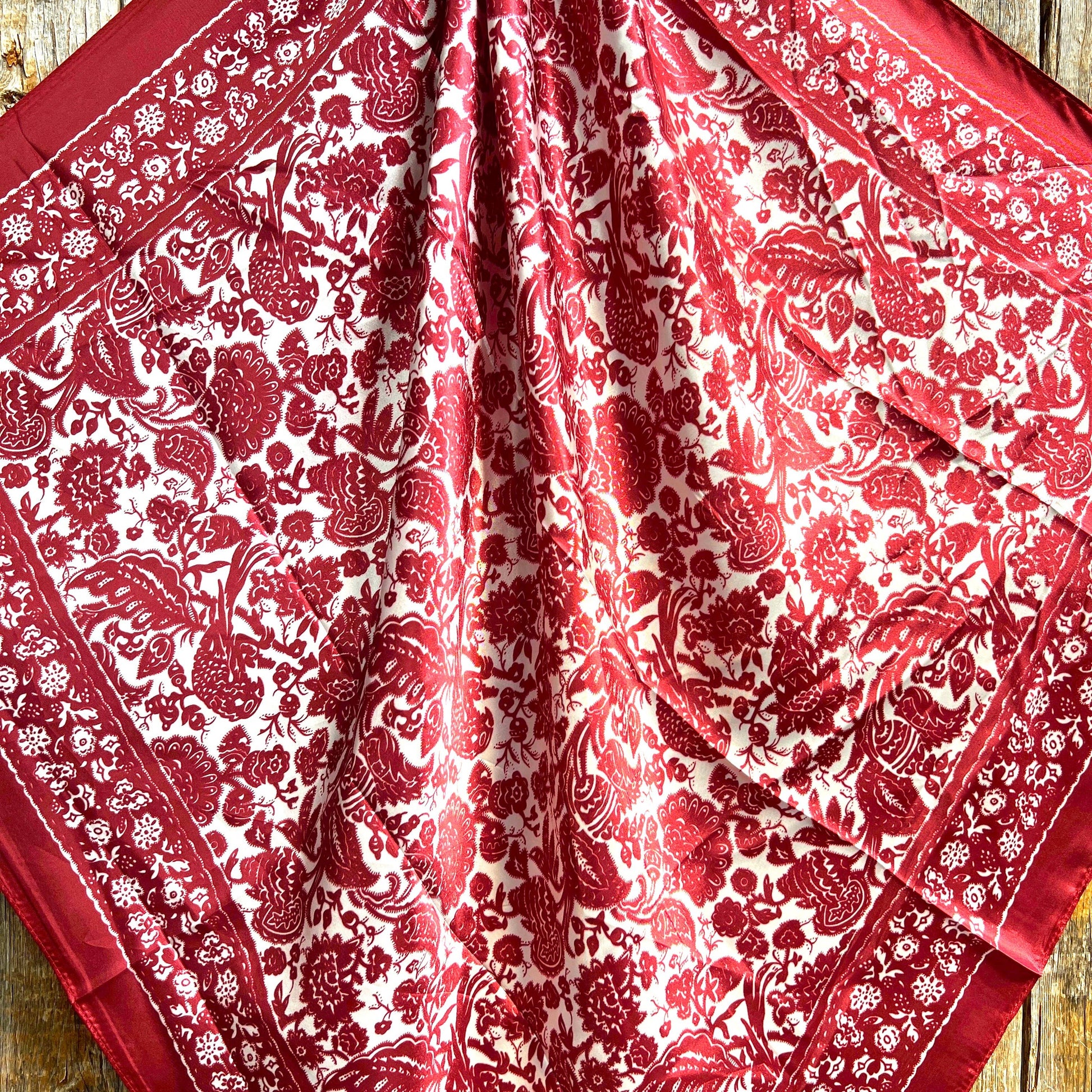 Our classic wild rag/scarf in a deep red decorated with a soft cream paisley. It is a square and measures 35" x 35". It is sure to add a bright pop of color to any outfit. 100% machine washable polyester, silky and soft.