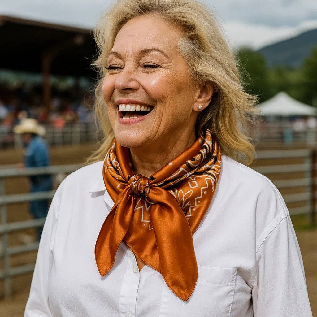 Our classic wild rag/scarf in rust paisley. A perfect square - measuring 35"x35". Adding that extra touch of a western style to your outfit. 100% soft silky feeling polyester is durable to keep you warm in the cold and fashionable for any occasion. Plus it's machine washable!