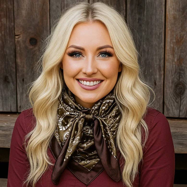 Our classic wild rag/scarf trimmed in brown and with a sage floral paisley pattern. A perfect square - measuring 35"x35". Adding that extra touch of a western style to your outfit. 100% soft silky feeling polyester is durable to keep you warm in the cold and fashionable for any occasion. Plus it's machine washable!