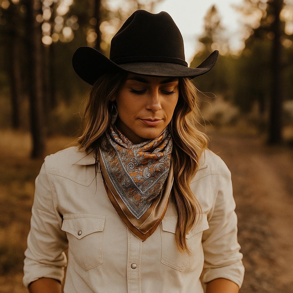 Our stylish yellow and tan paisley wild rag/scarf a perfect square - measuring 35"x35". Adding that extra touch of a western style to your outfit. 100% soft silky feeling polyester is durable to keep you warm in the cold and fashionable for any occasion. Plus it's machine washable!