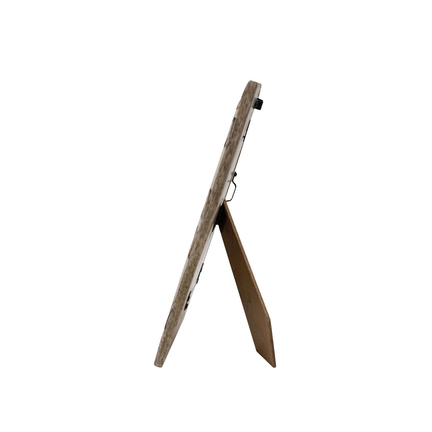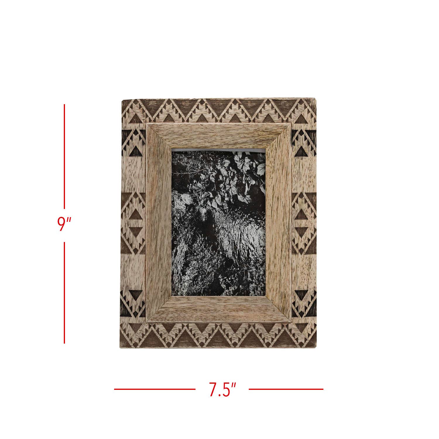 The 4x6 Hand Carved Beau Wood Picture Frame is perfect for western, farmhouse, and rustic decor. This hand carved photo frame features a geometric pattern rubbed with brown and black stain. Holds up to a 4x6 size photo. Easy tab back allows convenient access to change out photo. The mango wood used is part of a sustainability effort in India. For each tree harvested, at least one is planted in its place. Hang on a wall with 2 sawtooth hanger options or display on a desk, mantel, or table with easel back.