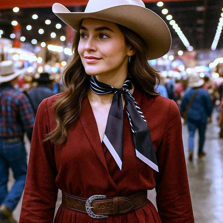 Western-Inspired Skinny Mini Scarf brings a modern twist to the traditional wild rag. Why you'll love it: * Black and white stripes * Lightweight, 100% polyester * Can be used for as a purse wrap, headband, neckerchief and more! * Express your western style, dress up any outfit * Measuring 34" x 2.5"