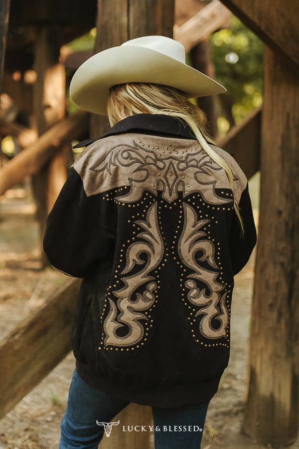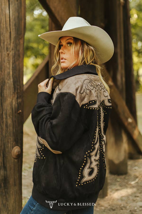 Add a touch of western flair to your style with our Black Boot Stitch Suede Embroidered Bomber Jacket! Featuring a convenient zipper closure, this jacket is the perfect choice for any occasion, especially the NFR. Stay stylish and comfortable with our premium quality jacket!