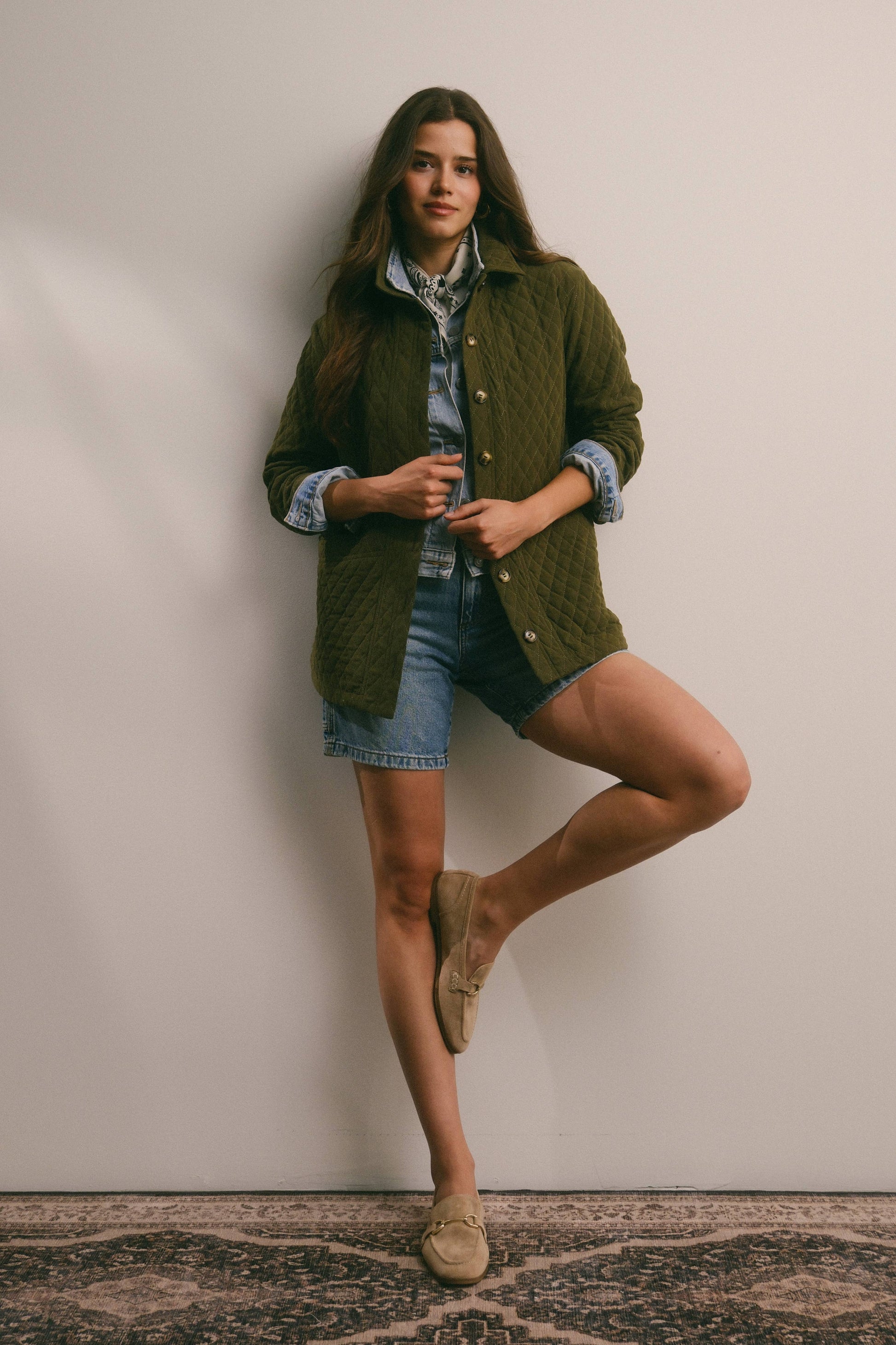 This Diamond Quilted Corduroy Jacket combines lightweight comfort with full lining for an easy, cozy fit. Its olive green shade adds a versatile, timeless touch to your wardrobe, perfect for layering on cooler days without bulk. Stay stylish and comfortable wherever you go.