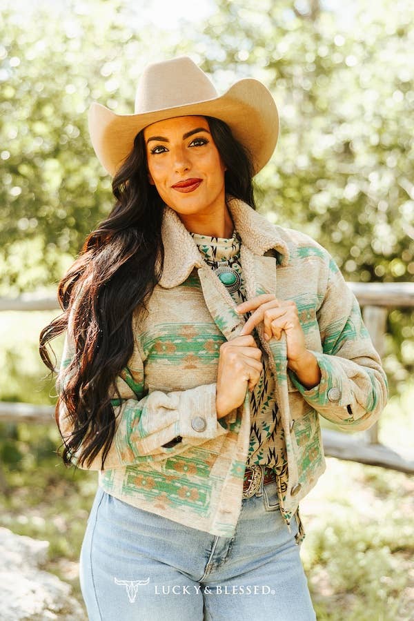 This cozy cropped jacket features a rich sand-toned base woven with earthy green and terracotta Aztec-inspired patterns that evoke desert sunsets and vintage cowgirl charm. The contrast sherpa collar adds warmth and textural contrast, while front button closures and flap accents bring a classic, rugged finish.