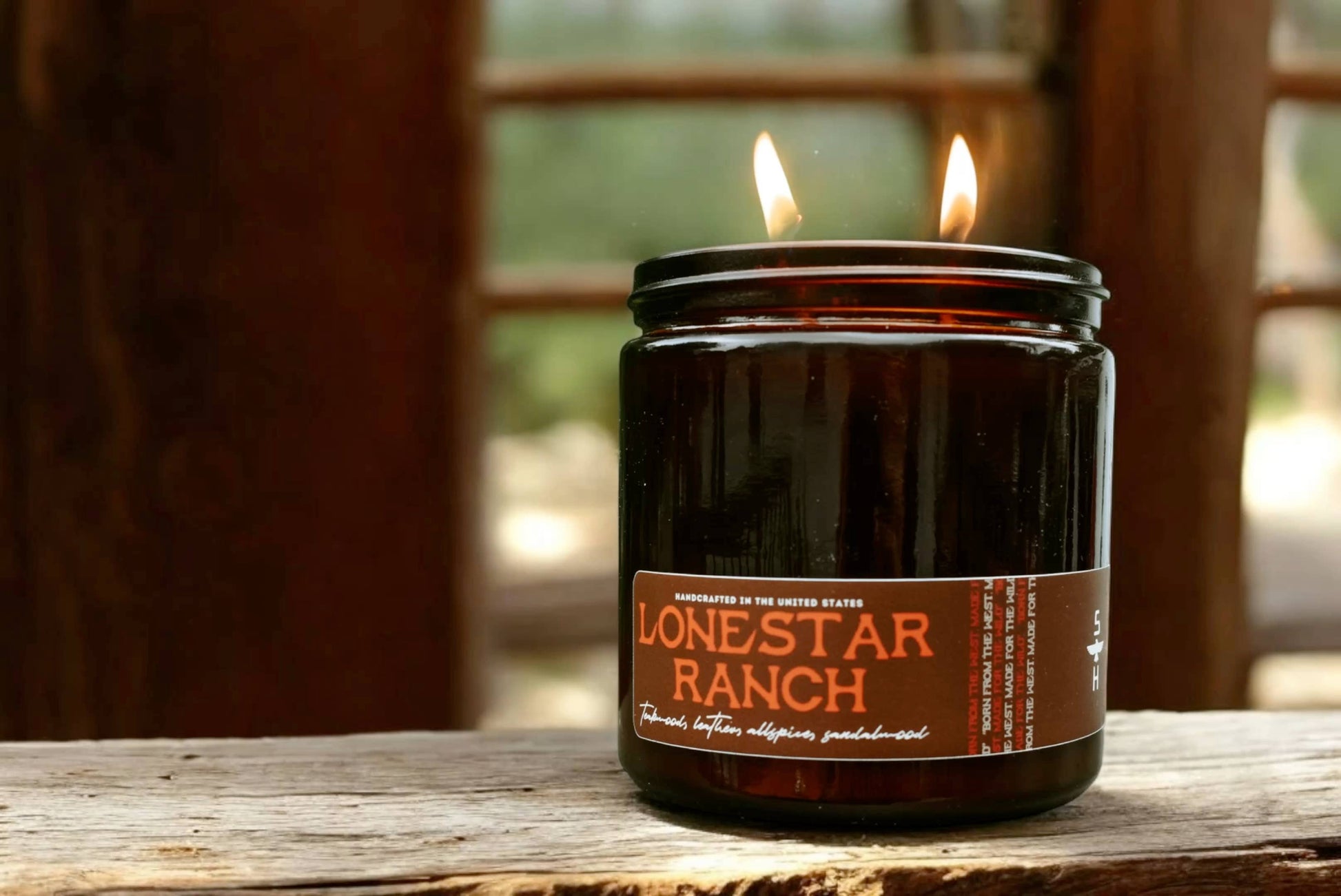 Lonestar Ranch is a bold, complex scent with wide appeal. It leads with spicy top notes of allspice blended with rich leather. Middle notes of tobacco leaf and clove blend into the woody, deep base of sandalwood, amber, and peppercorn. Double wicked / Burn time: 80+ hours. 13OZ Candle Scent Characteristics: Earthy and Bold Our candles are are free from carcinogens, phthalates, reproductive toxins, and other potentially hazardous chemicals often found in most artificial candles. We use a blend of high quality, essential and fragrance oils with all natural coconut/soy wax and an organic cotton wick.