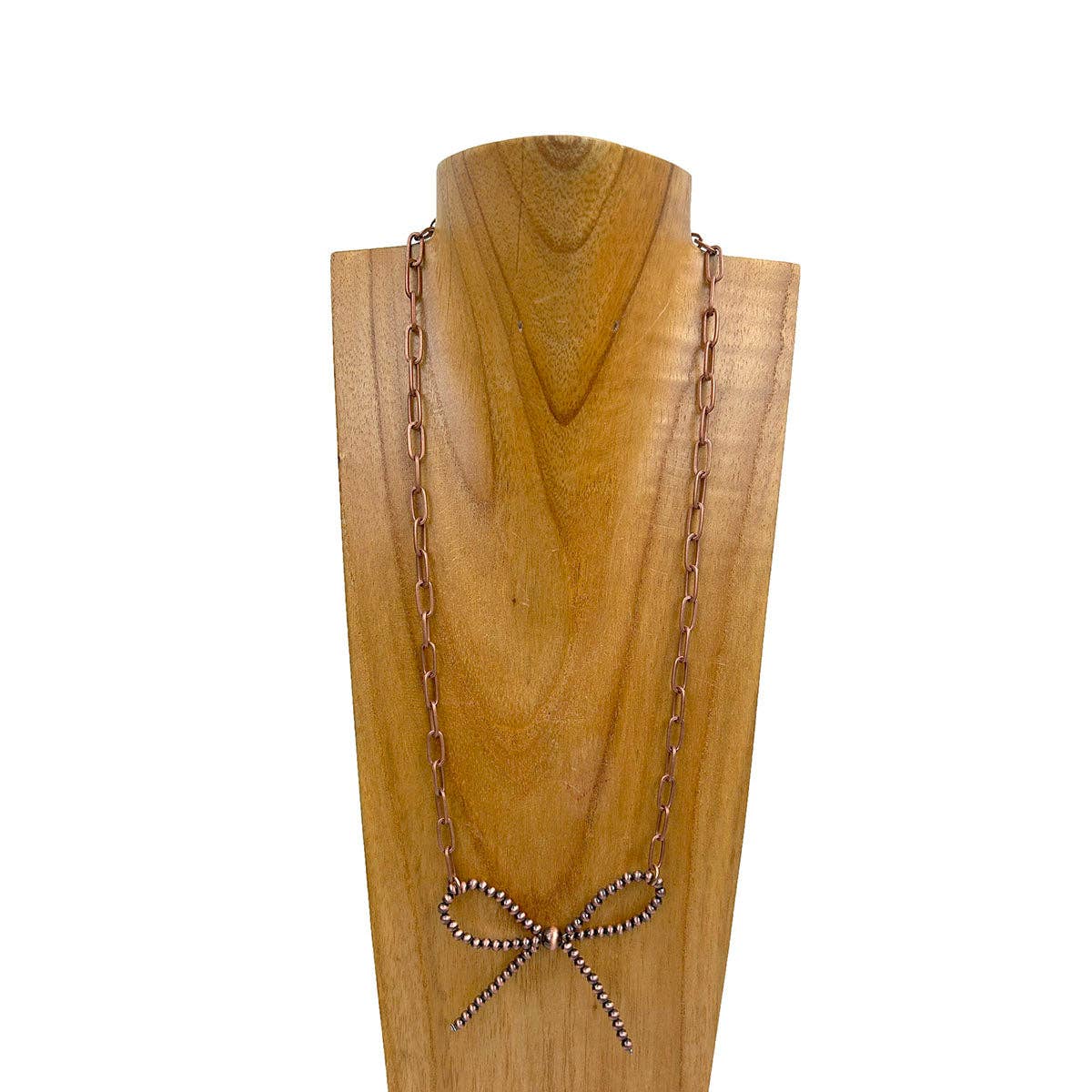 Elevate your style with this 24-inch Copper Pearl Beads Bow Tie Necklace. Crafted from rich copper metal and accented with lustrous copper pearl beads, it offers a unique blend of elegance and modern charm. Its bow tie detail adds a sophisticated touch, making it perfect for both casual and formal occasions. Durable and eye-catching, this necklace effortlessly enhances any outfit with a warm, polished finish.
