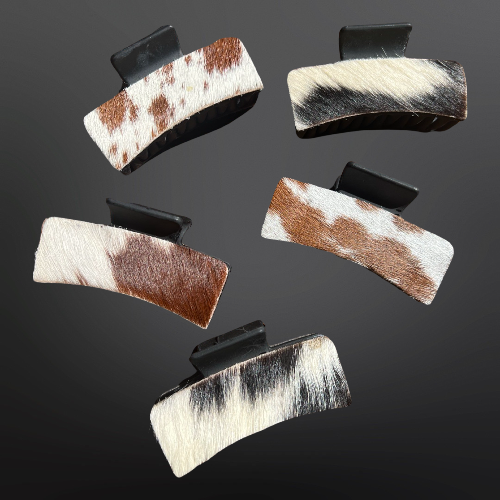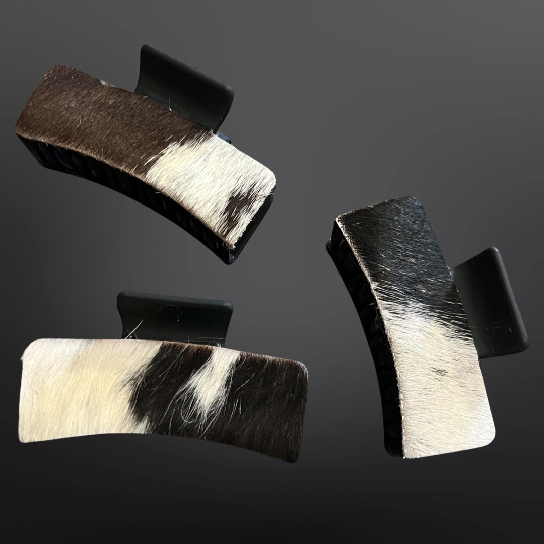 A very heavy duty claw hair clip adorned with our favorite material. Natural cowhide in assorted patterns and colors. Matte black clip (glossy black also available).