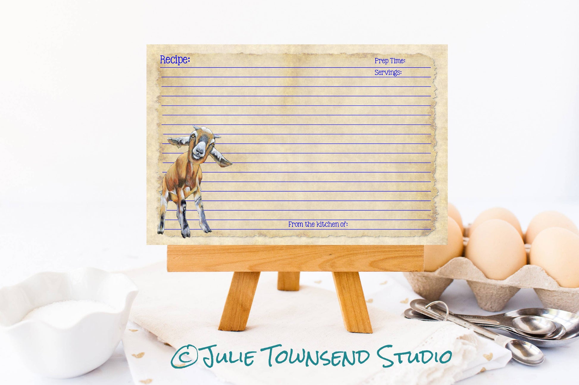 FARMHOUSE THEMED RECIPE CARDS 109 - BUTTERCUP The backside of each card has the antique paper and line design, but with no artwork. Handwritten recipe cards make the perfect keepsake for family recipes. Lines and design printed on the back to give plenty of room to write. 👩 🍳 Featuring my original artwork 👩 🍳 Dimensions: 4" H x 6" W 👩 🍳 Printed on sturdy cardstock.