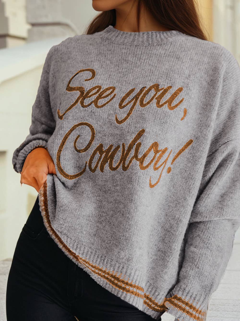 Wrap yourself in charm with the See You Cowboy Embroidered Western Graphic Sweater. Featuring detailed western embroidery, this cozy sweater brings a touch of rustic flair to your everyday wardrobe. Perfect for layering, it combines comfort with a playful nod to cowboy style, making it an irresistible choice for those who love a unique, heartfelt look. Step out with confidence and warmth that turns heads wherever you go.